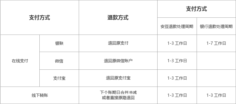 溫馨提示:退款周期僅供參考,具體退款周期可能會受銀行、支付機構等相關因素影響。